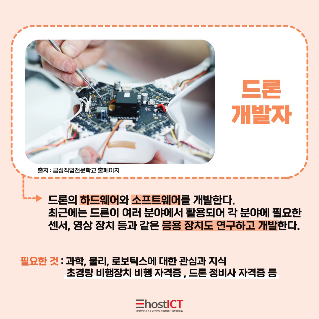 앞서 드론 전문가는 조종사와 개발자로 구분된다고 서술하였는데요. 후자의 사례에 속하는 드론 개발자는 하드웨어와 소프트웨어를 개발하는 역할을 합니다. 4차 산업 시대를 지나며 최근 드론은 여러 분야에서 활용되고 있어 센서, 영상 장치 등과 같은 응용 장치 또한 연구&개발을 하게 됩니다.