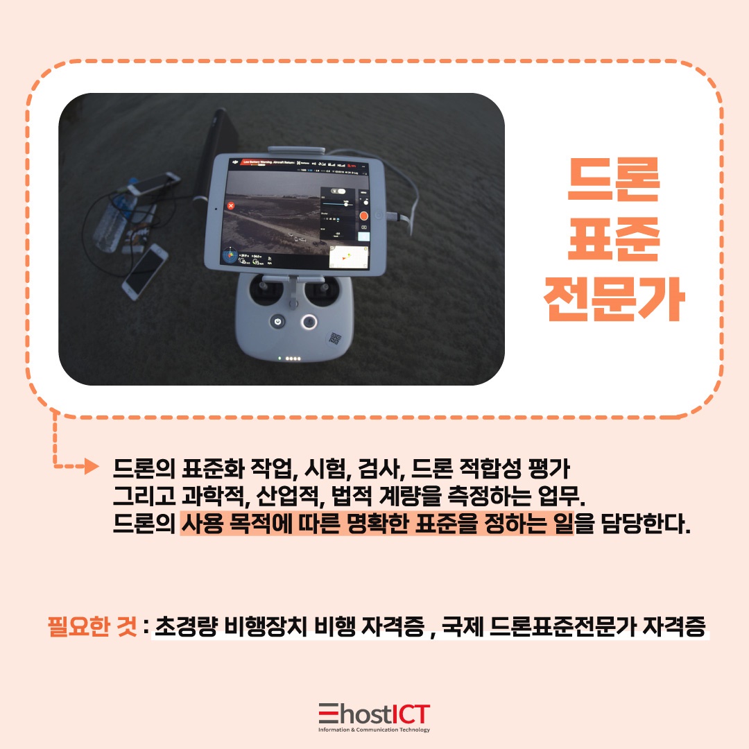 드론의 표준화 작업, 시험, 검사, 적합성 등을 평가하는 역할을 수행하는 드론 표준 전문가는 과학적, 산업적, 법적 계량 등을 측정하고 분석하여 표준화를 돕는 역할을 합니다. 드론은 택배용, 감시감찰, 농업용, 긴급의료용 등 수많은 분야에서 활용이 되게 되는데 각기 다른 드론 활용 환경과 분야에 대해 표준을 지정하고 관리, 인가 해주게 됩니다.