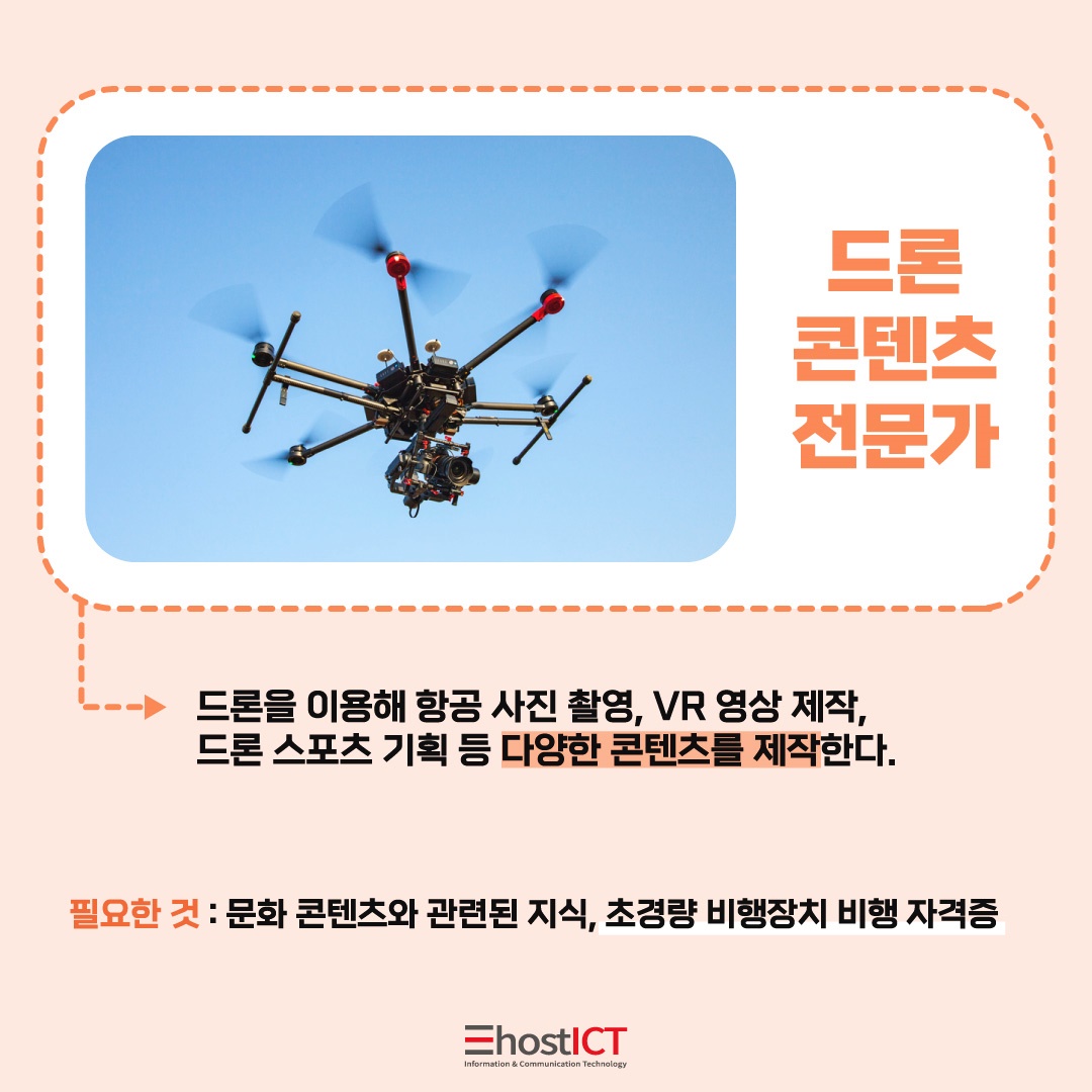 최근 미티어 콘텐츠는 기성 대중매체인 신문사, 방송국을 넘어 유튜브를 포함한 온라인 미디어 플랫폼 강세가 이루어지고 있는데 드론 콘텐츠 전문가는 드론 기술을 활용하여 양질의 콘텐츠를 생산하는 역할을 하여 그 수요가 매우 높아지고 있는 모습입니다.