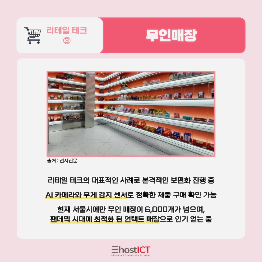 안녕하세요, 이호스트ICT입니다. 요즘 잡지나 신문, 칼럼 등을 읽다 보면 ‘리테일테크’ 라는 용어를 종종 만날 수 있는데요. 리테일테크(Retailtech)는 소매, 소매점을 뜻하는 Retail과 기술을 뜻하는 Technology의 합성어입니다. 즉, 우리가 흔히 이용하는 매장에 첨단 ICT(정보통신기술)를 접목하는 것을 말하는데요.