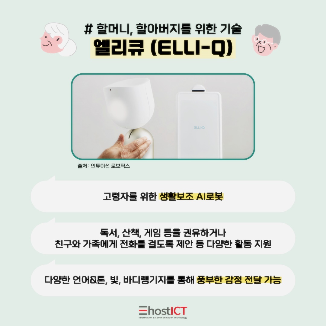 첫 번째로 소개할 IT 기술을 <엘리큐>입니다. 고령자를 위한 생활보조 AI 로봇으로 출시가 된 ELLI-Q는 독서/산책/게임 등을 권유하거나 친구와 가족에게 전화를 걸도록 제안을 하는 등 다양한 생활 활동을 지원합니다.