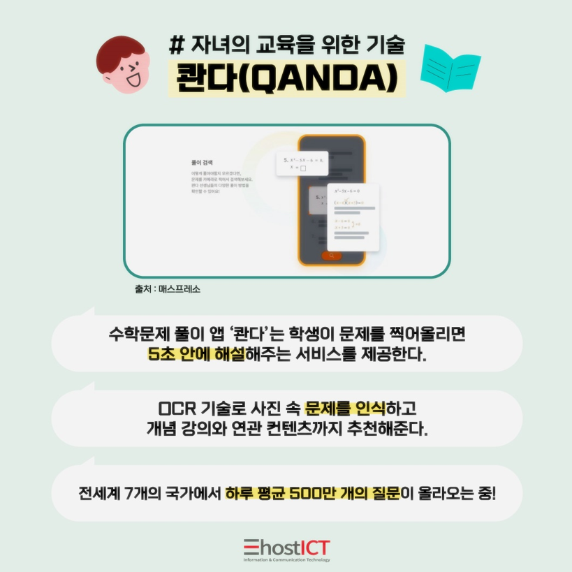 콴다는 OCR기술*을 토대로 제작된 소프트웨어라고 하는데요. 사진(이미지) 속 문제를 텍스트화하여 인식하고 개념 강의와 연관 컨텐츠까지 추천 해준다고 합니다. 전 세계 7개국에서 하루 평균 500만 개의 질문이 업로드 될 정도로 활성화되었다고 하는데요. 여러분께서도 아이의 교육에 관련되어 편리한 기술이 없을까 고민을 하신다면 이 앱을 한 번 활용해보시면 어떨까요?