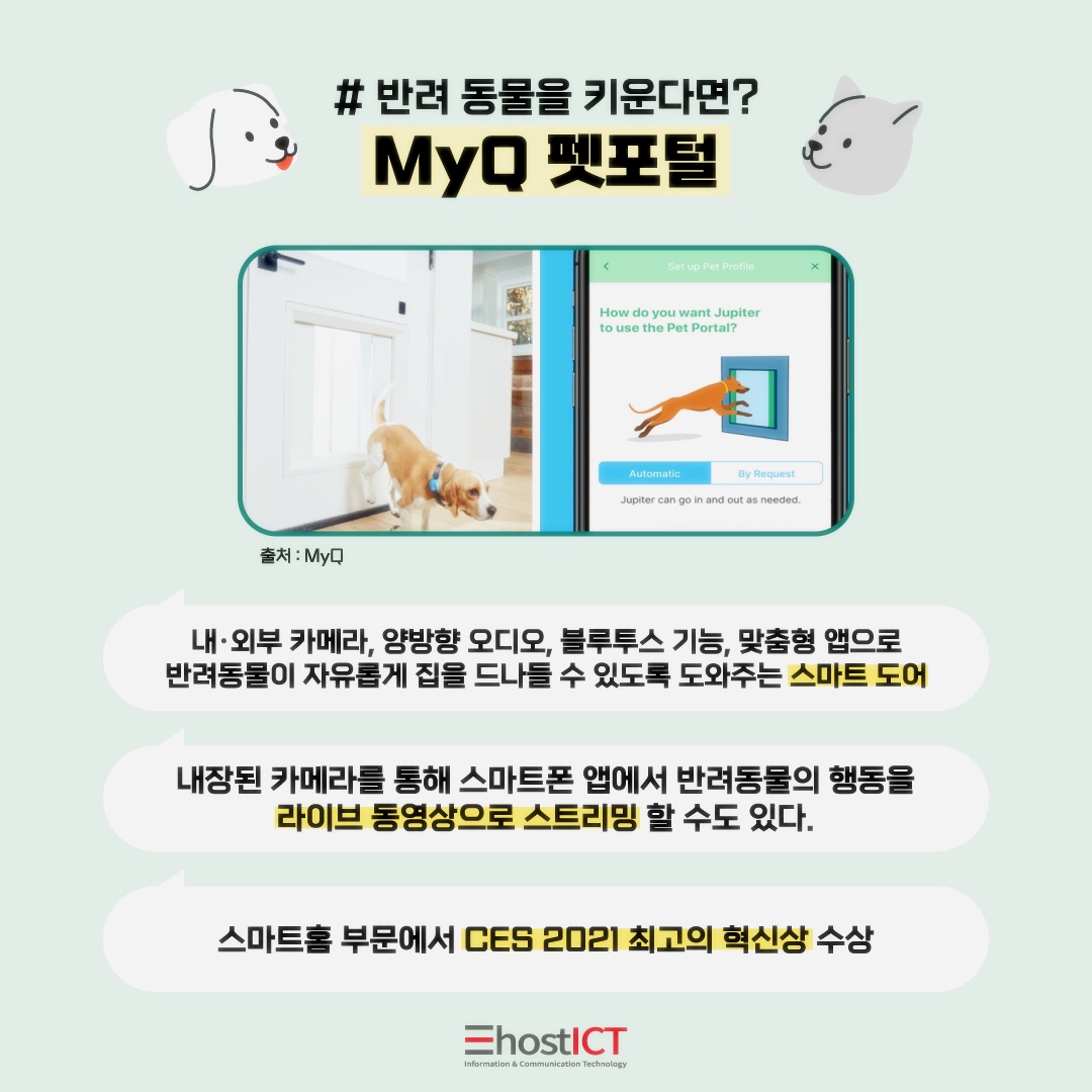 대한민국에서 반려동물을 양육하는 가족이 1,000만 가구에 이르고 있다고 하는데요. 펫휴머니제이션*이 대두됨에 따라 반려 가족으로써 자리잡은 우리 댕냥이들! 이들을 위한 스마트 IT 제품도 존재하는데요. 스마트 도어 ‘MyQ 펫포털’은 내외부 카메라, 양방향 오디오, 블루투스, 맞춤형 앱을 활용하여 가정에 사람이 없어도, 반려동물이 자유롭게 집을 드나들 수 있도록 돕는 시스템입니다.
