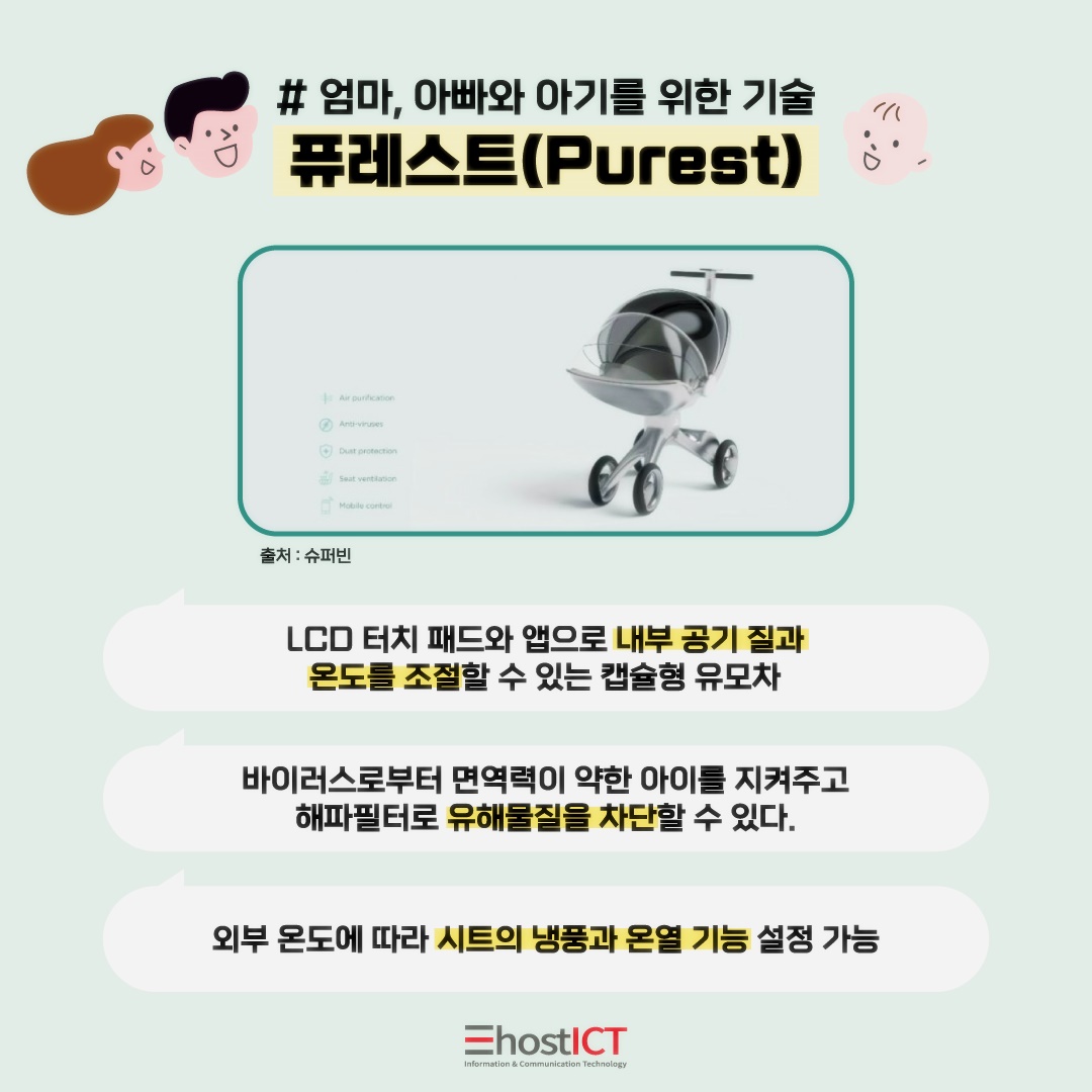 아기를 양육하는 부모님이라면 주목할 만한 IT 제품! 바로 스마트 유모차 “퓨레스트”인데요. 지난 2021년 iF 디자인 어워드에서 본상을 수상하기도 한 퓨레스트 유모차는 LED 터치패드와 앱으로 내부의 공기 질과 온도를 조절할 수 있는 캡슐형 유모차 입니다. 특히 최근 몇 년 사이 팬데믹을 거치면서 바이러스로부터 면역력이 약한 영유아에 대한 걱정을 많이 하실텐데요. 해파 필터로 외부 유해물질을 차단하는 기능을 하여 염려를 덜어낼 수 있도록 하는 제품입니 또한, 외부 온도에 따라서 시트의 냉풍과 온열 기능을 조절할 수 있어 온도, 습도, 위생 등을 최적화 하는 기능을 합니다.