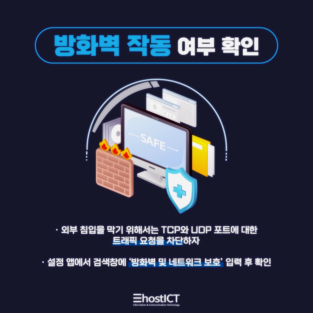 외부에서의 트래픽 침입을 막기 위해서는 TCP와 UDP 포트에 대한 트래픽 요청을 차단하는 방화벽이 작동 되어야 합니다. 방화벽 작동 여부는 설정 앱에서 ‘방화벽 및 네트워크 보호’ 입력 검색 후 확인이 가능합니다.
