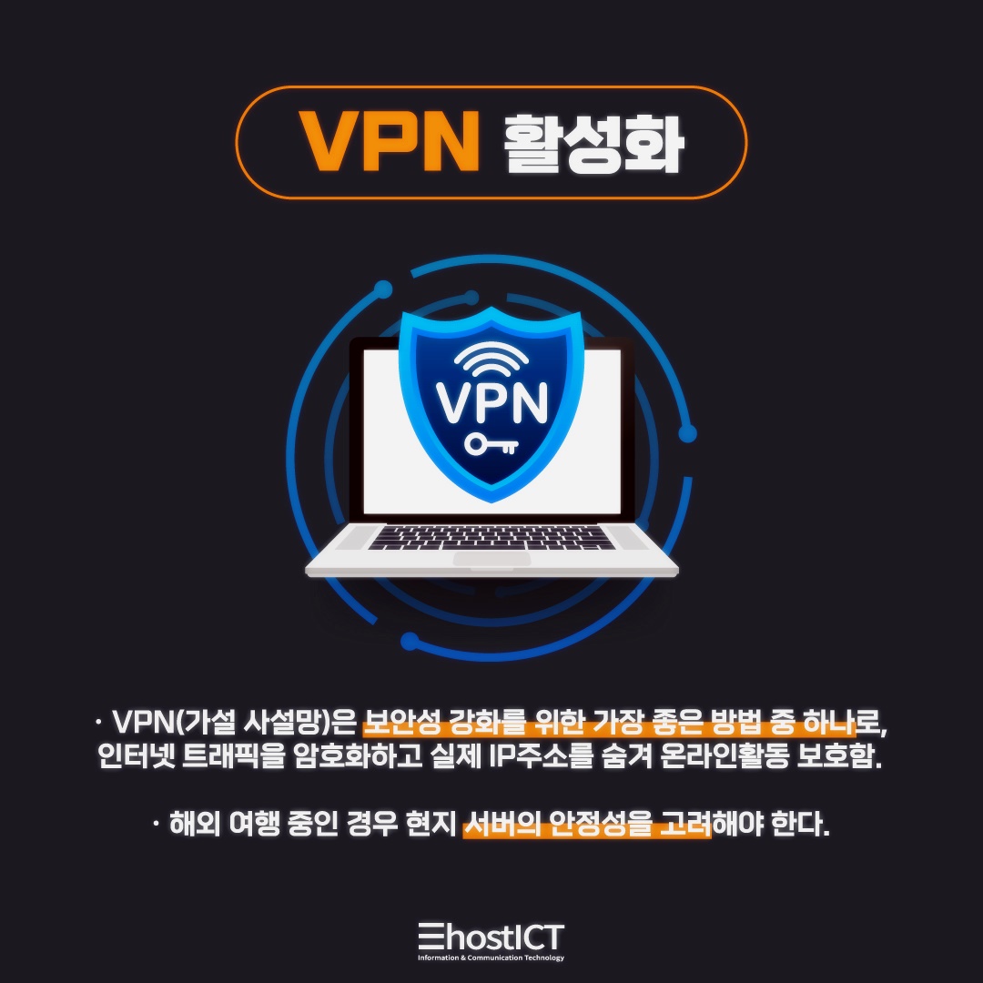 VPN(가설 사설망)은 보안성 강화를 위해 가장 좋은 수단 중 하나인데요. VPN을 활용하면 인터넷 트래픽을 암호화하며 활동할 수 있으며, 실제 IP 주소를 숨겨 온라인 활동을 보호할 수 있습니다. 가설 사설망에 접속하게 되면 사용자의 모든 전송 활동은 가설 사설망을 통과하게 되어 누군가 전송을 점검하거나 피싱 하고 있다고 하더라도 송수신하는 내역만 확인이 가능하며 구체적인 트래픽 정보는 노출되지 못합니다.