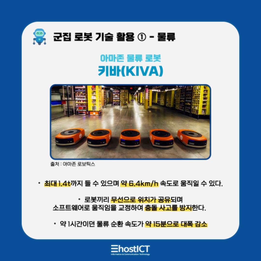 아마존에서도 군집로봇들을 유용하게 활용을 하고 있기도 합니다. 뉴저지주 로빈스빌에 위치한 아마존 물류센터에는 5,000여 대의 로봇이 인력을 대신하여 복잡한 운송 시스템을 이루고 있는데요. 아마존에서는 조만간 25개의 물류센터에 6만 5000대까지 군집로봇의 배치를 늘릴 계획이라고 합니다.