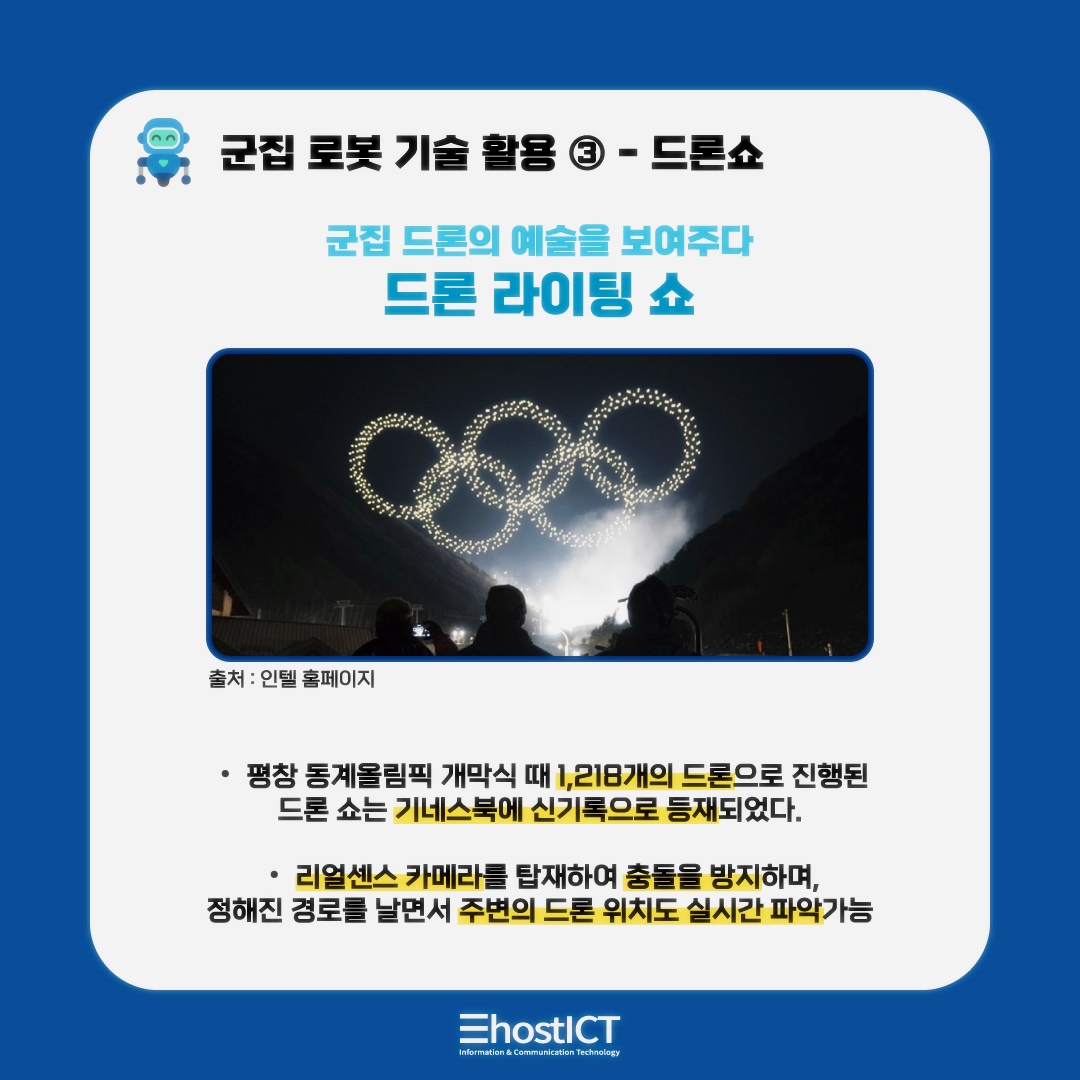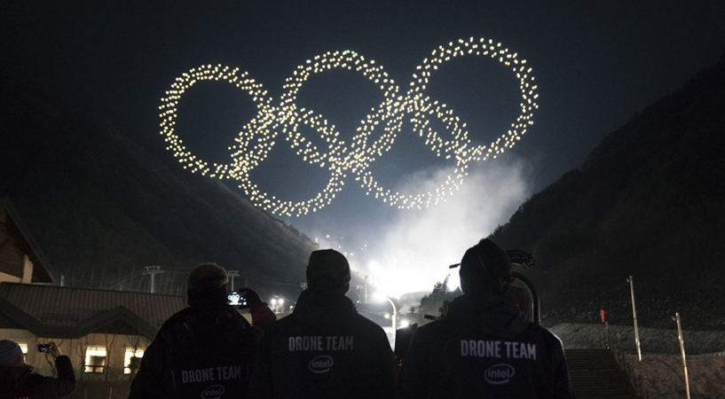 지난 2018년 2월 9일, 평창 올림픽 개막식에서는 드론 1,218대의 군집 비행이 오륜기 형상을 펼치는 장관을 볼 수 있었는데요. 라이브가 아닌 녹화 영상이긴 했지만 단 한 명의 엔지니어가 조종한 수많은 드론이 움직여 만들어낸 오륜기의 모습은 보는 사람들로 하여금 입을 다물지 못하게 하였는데요.