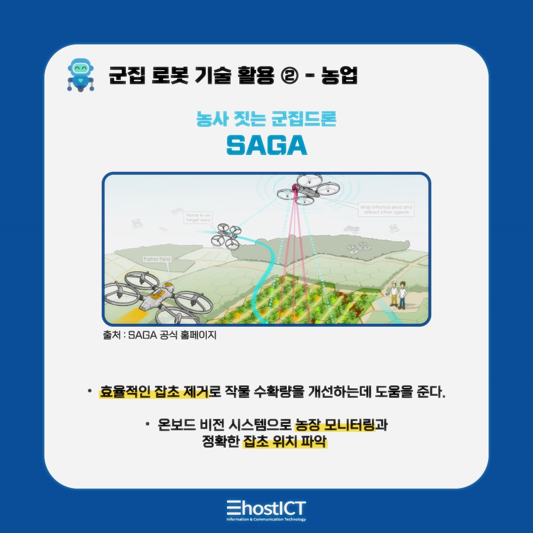 유럽에서는 군집로봇 드론을 활용하여 농업에 활용을 하는 프로젝트에 초점을 맞추고 있습니다. 유럽의 개방형 로봇 개발기구인 ECHORD++(이코드++)에서는 농업 애플리케이션을 위한 군집 로봇 프로젝트인 ‘SAGA(Swarm Robotics for Agricultural Applications)’을 추진 하고 있는데요. 인간의 힘으로 혹은 무분별하게 헬기로 뿌리던 농약 대신 잡초 제거를 효율적으로 수행하여 작물 수확량, 작물의 품질을 개선하는 데 도움을 주도록 하는 역할을 하고 있습니다. 무차별적으로 농약을 살포 하는 것이 아니라 잡초가 많다고 판단된 구역에 우선순위를 매겨 제초 활동을 함에 따라 생산성 증가는 물론 비용 절감이 가능할 것으로 기대되고 있는 기술입니다.
