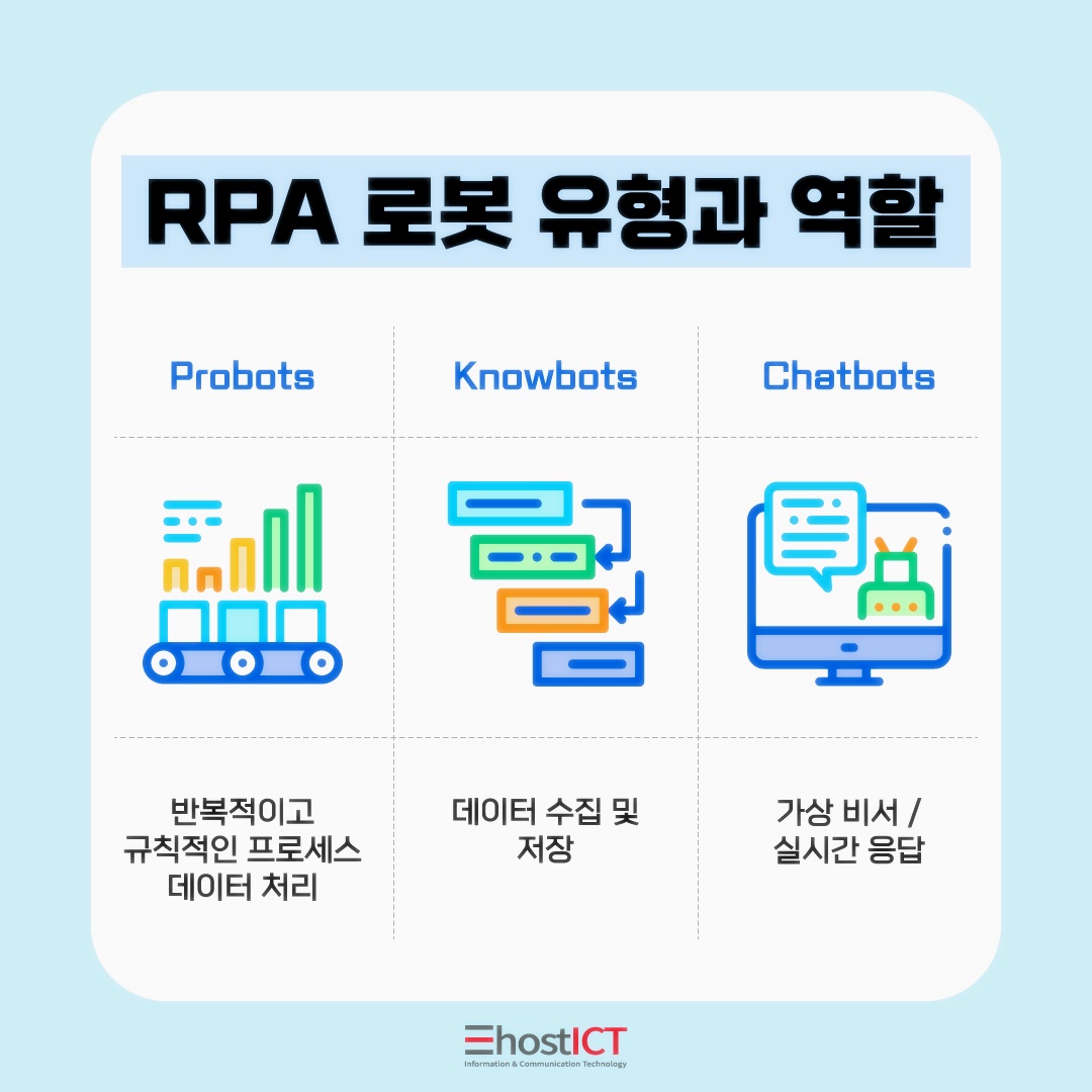 RPA 로봇의 유형은 현재로써 크게 3가지로 나뉘는데요. Probots은 반복적이고 규칙적인 프로세스 데이터를 처리합니다. Knowbots은 데이터 수집 및 저장 역할을 주로 하며, Chatbots은 가상비서/실시간 응답 기능을 합니다. 기술 발전의 흐름에 따라 업무 분야는 앞으로도 더욱 깊고 넓어질 것으로 예상됩니다.