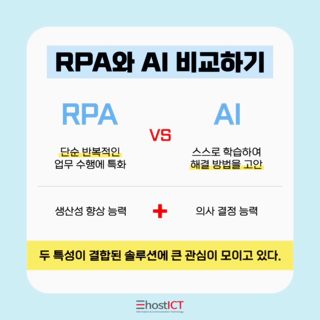 RPA는 AI와는 약간의 차이점을 가지고 있는데요. RPA는 단순 반복적인 업무 수행에 특화되었다면, AI는 스스로 학습(딥러닝, 머신러닝 등)하여 해결방법을 고안한다는 것이 가장 큰 차이점입니다. 다시 말해 RPA는 생산성 향상 능력을, AI는 의사 결정 능력을 중점적으로 보유하고 있는 것인데요. AI가 보다 적극적인 업무 수행 능력을 지니고 있다고 생각하실 수 있지만, 두 가지 특성 모두 현 산업 구조에서 반드시 필요한 부분입니다. 따라서 두 특성을 결합한 솔루션에 가장 많은 관심이 기울여지고 있어요.