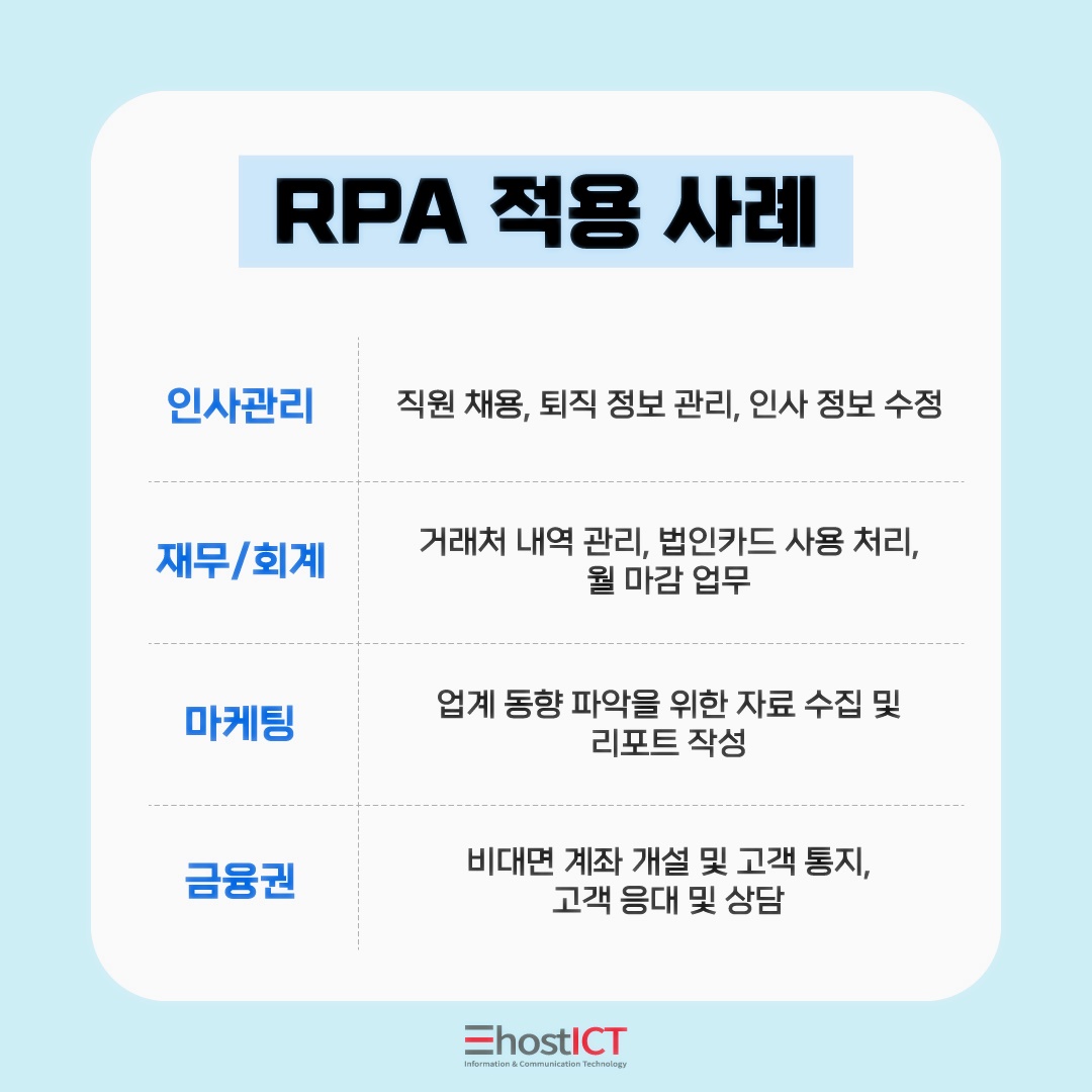 로보틱 프로세스 자동화는 전 산업계에서 두루 활용되고 있지만, 4가지 업무 분야에서 사례를 살펴보면 위와 같습니다. 인사 관리부터 재무/회계, 마케팅, 금융권 등에서 활발하게 활용이 되고 있어요.
