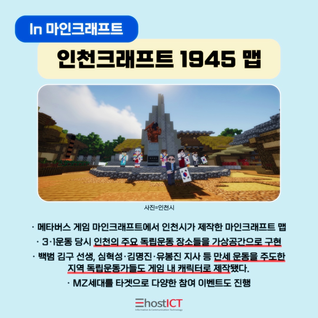 메타버스 게임인 마인크래프트 속에서 인천광역시가 한 맵을 제작하였습니다. 이름하여 '1945 맵' 인데요. 3.1운동 당시 인천 내 주요 독립운동 장소들을 가상공간 맵으로 구현한 것입니다. 백범 김구 선생, 심혁성, 김명진, 유봉진 지사 등 3.1 만세 운동을 주도한 독립운동가들도 게임 내 캐릭터로 제작이 되었는데요. MZ 세대들을 타겟팅 하여 다양한 참여 이벤트도 진행이 되어 활발한 참여와 호응을 이끌어내고 있습니다.