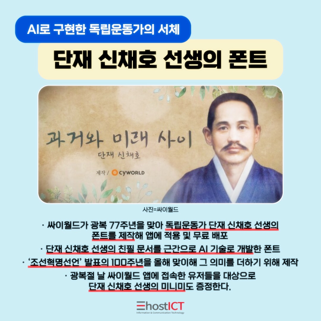 싸이월드에서는 광복 77주년을 맞이하여 독립운동가 단재 신채호 선생의 폰트를 제작해 앱에 적용 및 무료 배포 하였습니다. 실제 친필 문서를 근간으로 AI 기술을 활용해 개발한 폰트라고 하는데요. '조선혁명선언' 발표의 100주년을 올해 맞이하여 그 의미를 더하기 위해 제작되었다고 합니다. 광복절 당일에는 싸이월드 앱에 접속한 유저들을 대상으로 단재 신채호 선생의 미니미도 증정하였다고 하네요.