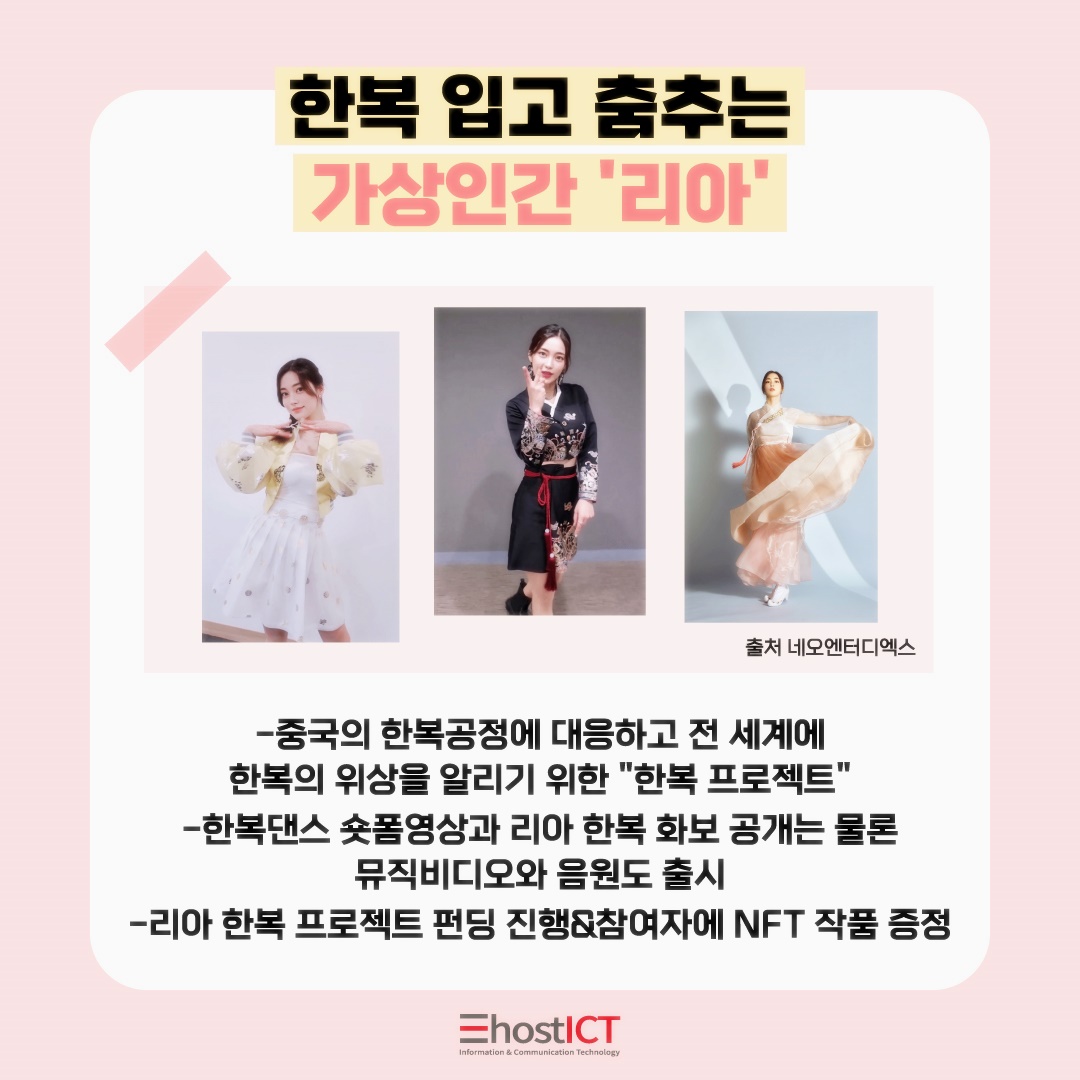 네오엔터디엑스에서 제작한 가상인간 '리아' 가 한복을 입었습니다. 한국의 아름다운 전통 복장인 한복을 입고 춤추는 리아의 모습은 숏폼 영상과 화보 공개 등을 통해 알려짐은 물론, 뮤직비디오와 음원도 출시가 되었는데요.