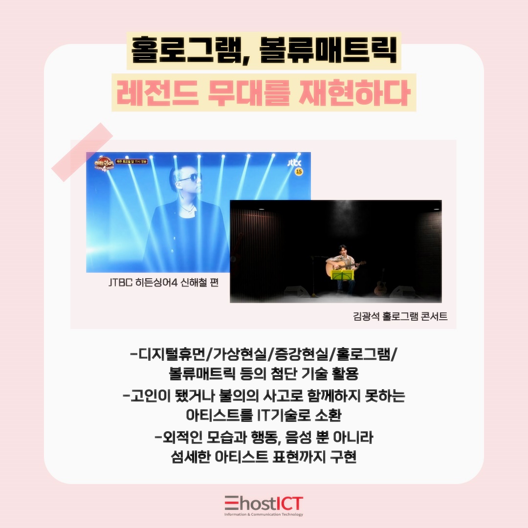 대표적인 사례로는 JTBC 히든싱어4 신해철 편, 김광석의 홀로그램 콘서트를 확인할 수 있습니다.