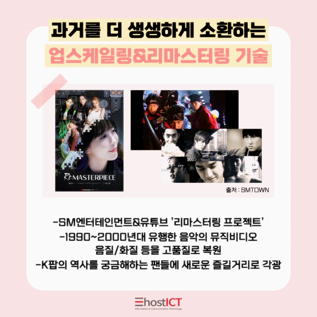 SM엔터테인먼트와 유튜브는 협업하여 '리마스터링 프로젝트'를 추진하여 1990~2000년대 유행했던 음악의 뮤직비디오들 음질/화질을 고품질로 복원하였습니다. 이 프로젝트로 K-Pop의 역사를 궁금해하는 팬들에게 새로운 즐길거리로 호응을 얻고 있으며 현재의 K팝도 더욱 관심도를 높일 수 있었다고 하네요.