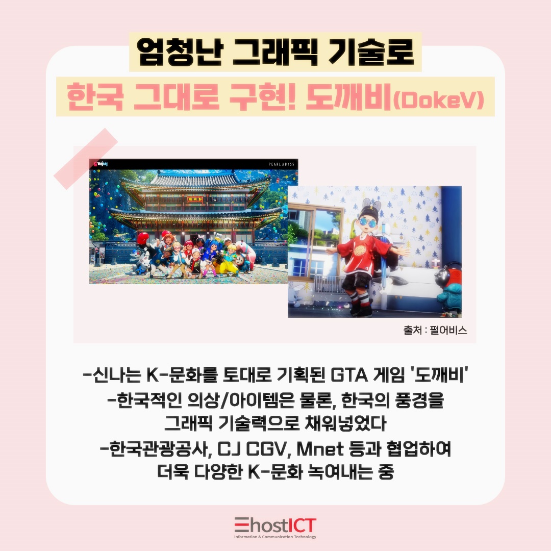 신나는 K-문화를 토대로 기획된 GTA 게임 '도깨비' 또한 화제입니다. 게임 속 캐릭터들은 한국적인 의상과 아이템을 착용하고 있으며, 한국의 풍경을 그래픽 기술력으로 채워넣었습니다. '한국을 그대로 구현했다' 라고 하여도 과언이 아닌 도깨비(DokeV) 는 한국관광공사, CJ CGV, Mnet 등이 협업한 결과라고 하네요.