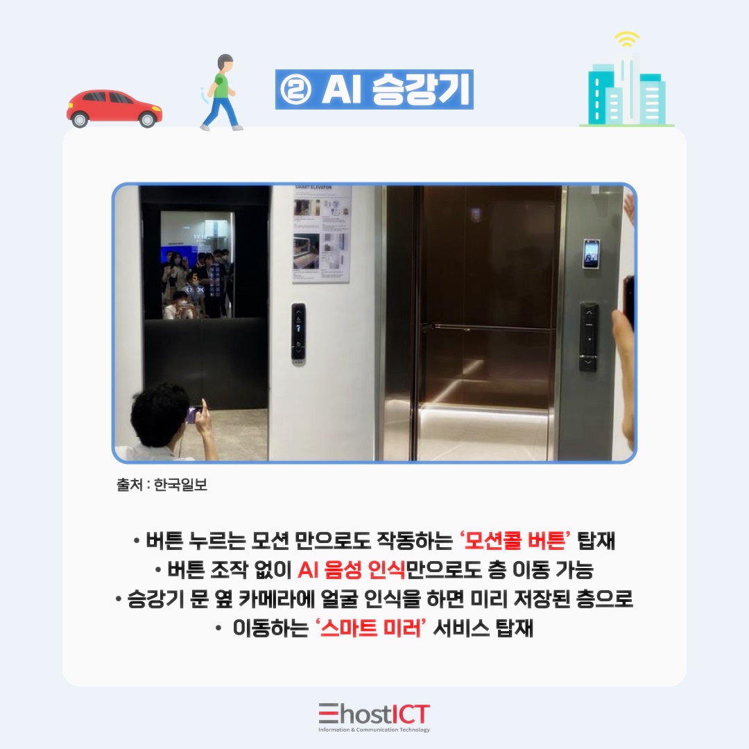 AI 기술이 탑재된 승강기도 있습니다. 버튼을 누르는 모션만으로도 작동하는 '모션콜' 기능이 있어, 개인 위생이 중요한 현 시대에 버튼 클릭 없이도 승강기를 작동시킬 수 있다는 것이 장점인데요.