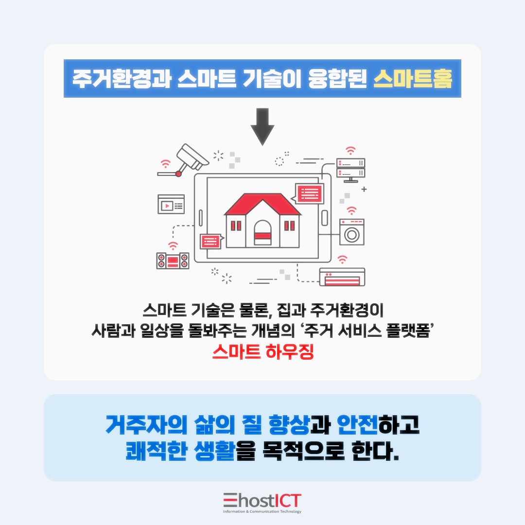 스마트 홈 시스템은 주거환경과 스마트 기술이 융합된 것으로, 각종 스마트 기술이 녹아 있어 집과 주거 환경이 사람과 사람의 일상을 돌봐주는 개념으로 '주거 서비스 플랫폼'역할을 하는 것을 말합니다. 궁극적인 목적은 거주자의 삶의 질 향상과 안전하고 쾌적한 생활이에요.