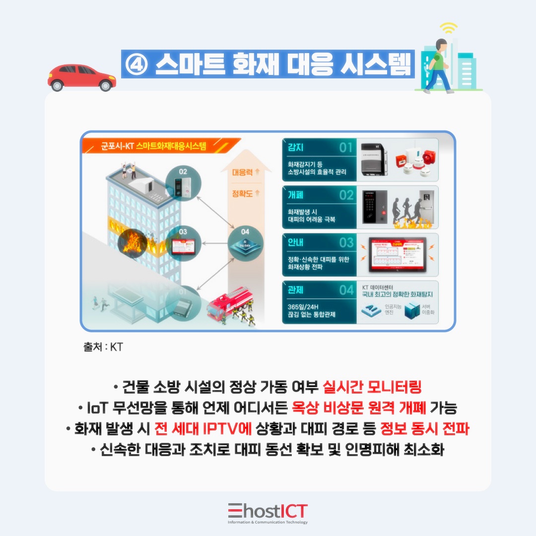 건물 소방 시설의 정상 가동 여부를 실시간 모니터링 하는 '스마트 화재 대응 시스템'도 스마트하우징의 대표적인 사례로 꼽히고 있습니다. IoT(사물인터넷) 무선망을 통해 언제 어디서든 옥상 비상문 원격 개폐를 작동 시킬 수 있는데요. 실제 화재 발생 시에는 전 세대 IPTV에 상황과 대피경로 등 정보를 동시 전파 하여 피해를 최소화할 수 있도록 도움을 줍니다. 이렇게 신속한 대응과 조치를 통해 인명 피해와 경제적 손실을 최소화할 수 있어 활발하게 도입 되고 있는 기술이라고 합니다.