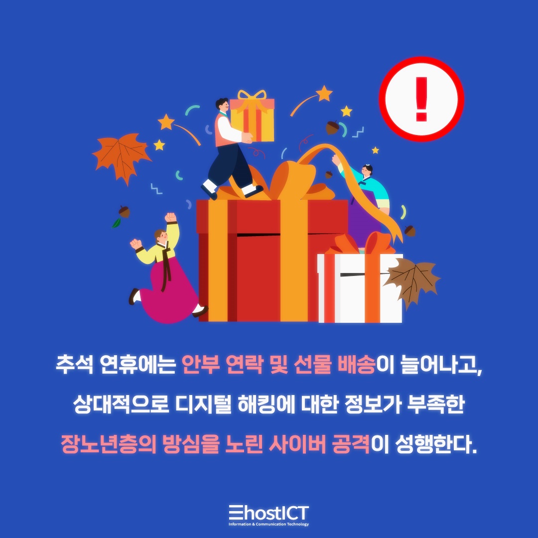추석을 포함한 연휴 기간이 되면, 다양한 수법을 통해 사이버공격이 발생합니다. 특히, 코로나 팬데믹으로 인해 '비대면 명절' 트렌드가 가속화되면서 택배 혹은 모바일 송금 기능으로 마음을 주고 받는 분들이 많아졌는데요.