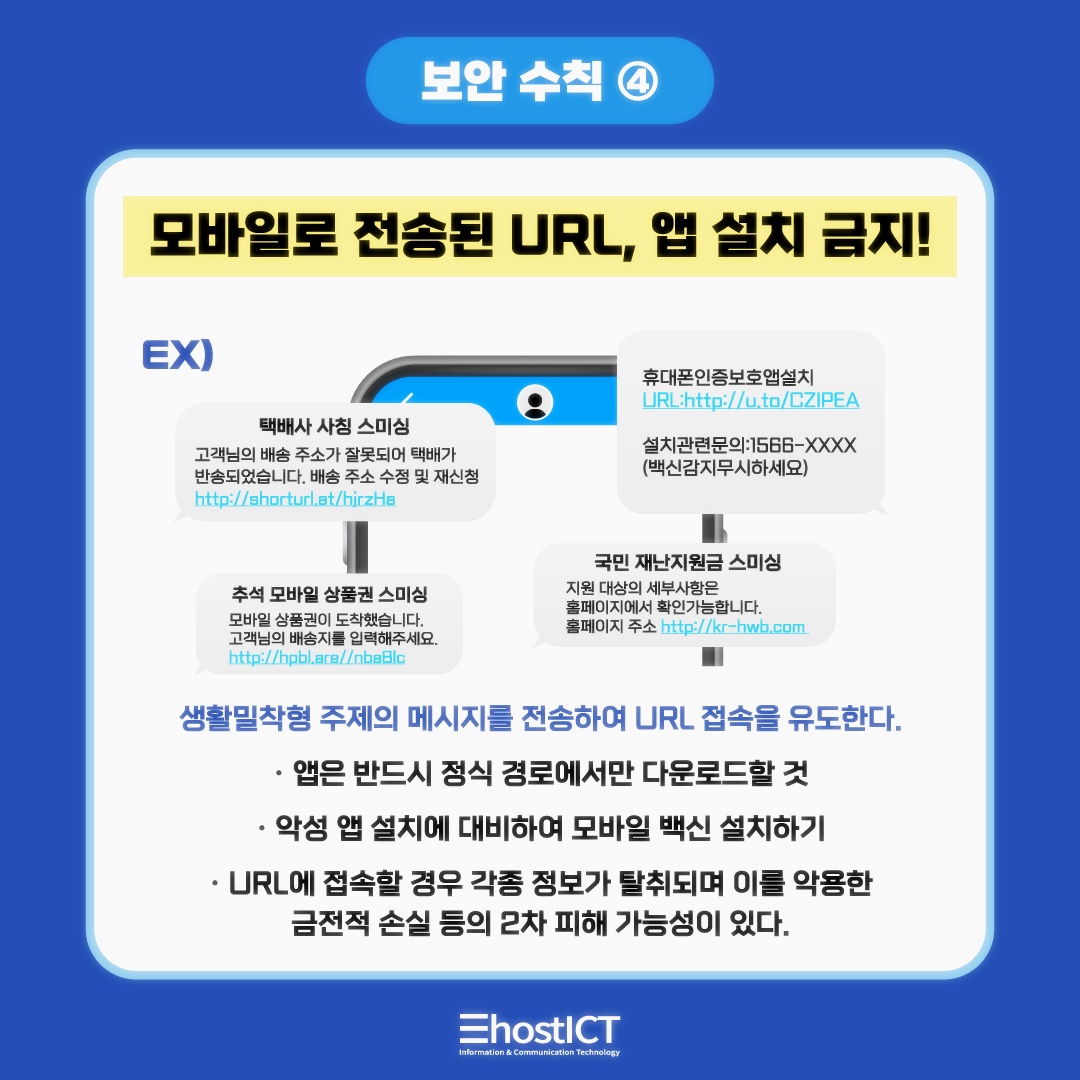 악성코드가 담긴 URL을 클릭하거나, 사칭 앱을 다운로드 할 경우 모바일 내 각종 정보가 탈취될 수 있으며, 이를 악용한 금전전 손실 등 2차 피해 가능성이 높아집니다.
