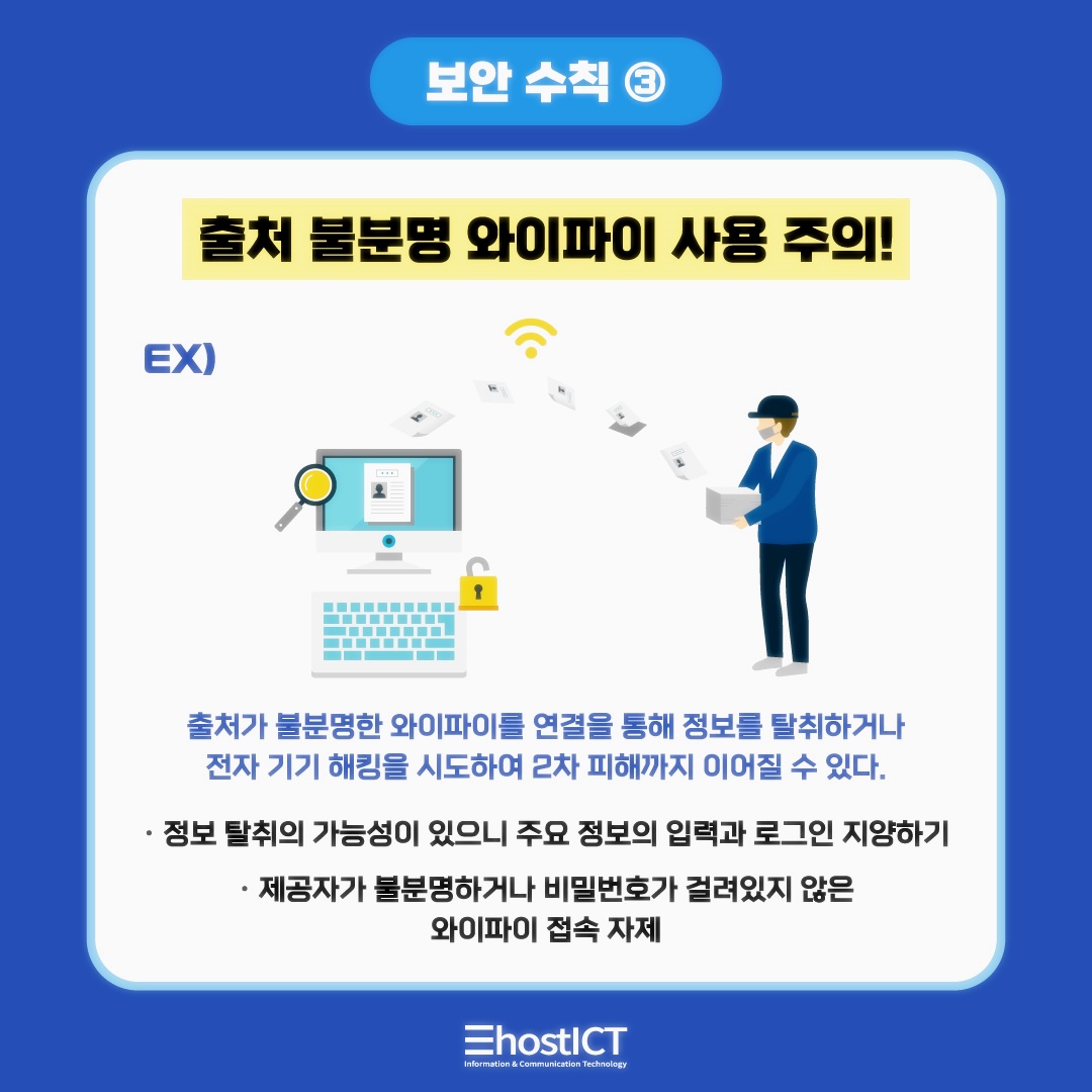 출처 불분명한 와이파이 사용을 경계해야 하는 것도 중요한 보안 수칙인데요. 출처가 불분명한 와이파이 연결이 된다면 개인정보를 탈취 당할 수 있으며, 전자 기기가 해킹되는 등 2차 피해로까지 이어질 수 있습니다. 신뢰할 수 없는 와이파이에는 되도록 연결하지 않는 것을 권고드리며, 주요 정보를 입력하거나 로그인 하는 것은 지양하는 것이 좋습니다.