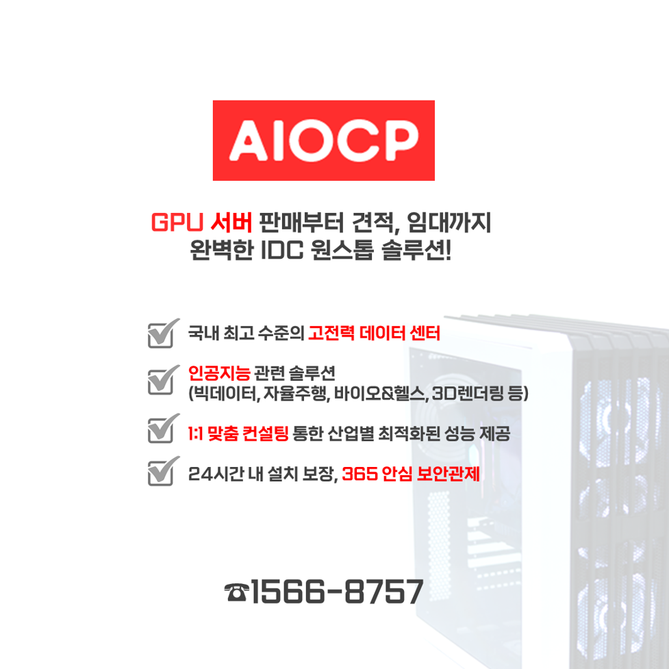 | [서버전문브랜드 AIOCP] AI 오디오 솔루션 업체 S / AI 기반 음원/음향 합성 기술을 위한 GPU 서버 납품 사례 (0) | 2022.04.15 |