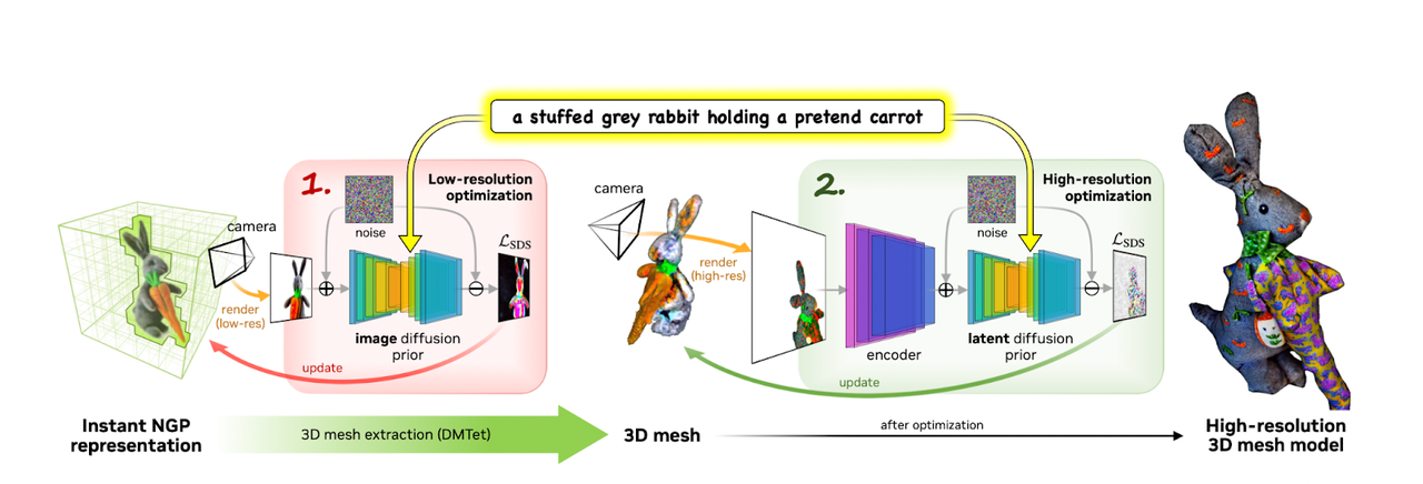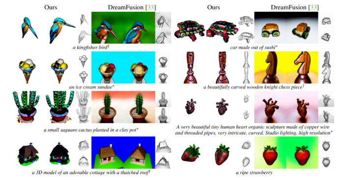 이 모델은 지난 9월 구글이 발표한 텍스트-3D 모델인 드림퓨전보다 2배 빠르게 3D 개체를 생성할 수 있다. 드림퓨전은 텍스트-이미지 생성 AI 모델을 사용해 2D 이미지를 생성한 다음 NeRF(Neural radiance field) 모델을 사용해 2D 이미지를 3D로 변환하는 것과 유사하게 매직3D는 텍스트에서 저해상도 3D 모델을 생성한 다음 고해상도로 최적화하는 2단계 프로세스를 사용한다. 그 결과 매직3D는 텍스트 프롬프트에서 고품질의 3D 출력을 빠르게 제공할 수 있다.