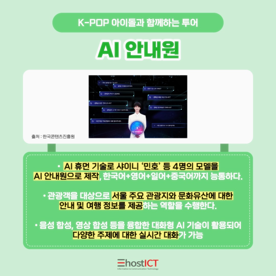 그런가하면 AI 휴먼 기술로 만들어진 샤이니 '민호'를 나만의 안내원으로 만나볼 수도 있습니다. 샤이니 민호를 포함한 총 4명의 한국 K-pop 아이돌을 모델로 하여 AI 안내원으로 제작을 한 것인데요.