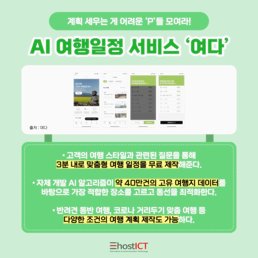 여행 계획을 세우는 것이 낯설고 복잡하다고 느끼시는 분들도 많으실텐데요. 특히 MBTI 끝 단어가 P이신 분들께서 많이 공감을 하실 것 같아요. 이러한 케이스를 위한 서비스가 바로 AI 여행일정 서비스 '여다' 입니다.