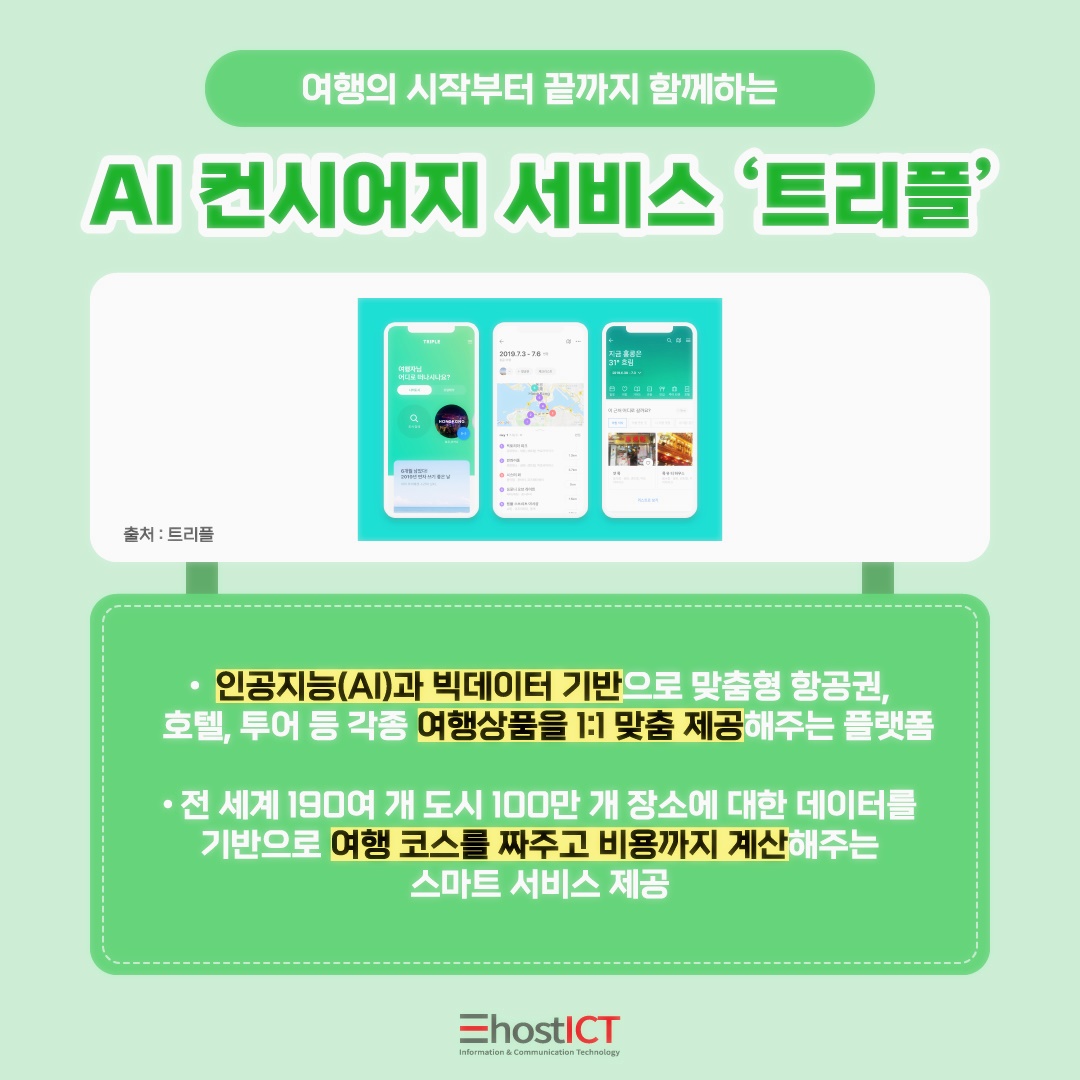 여행의 시작부터 끝까지를 함께하는 서비스, AI 컨시어지 서비스 '트리플'은 인공지능 AI 와 빅데이터 기반으로 맞춤형 항공권, 호텔, 투어 등 각종 여행 상품을 1:1 맞춤 제공 해주는 플랫폼입니다.