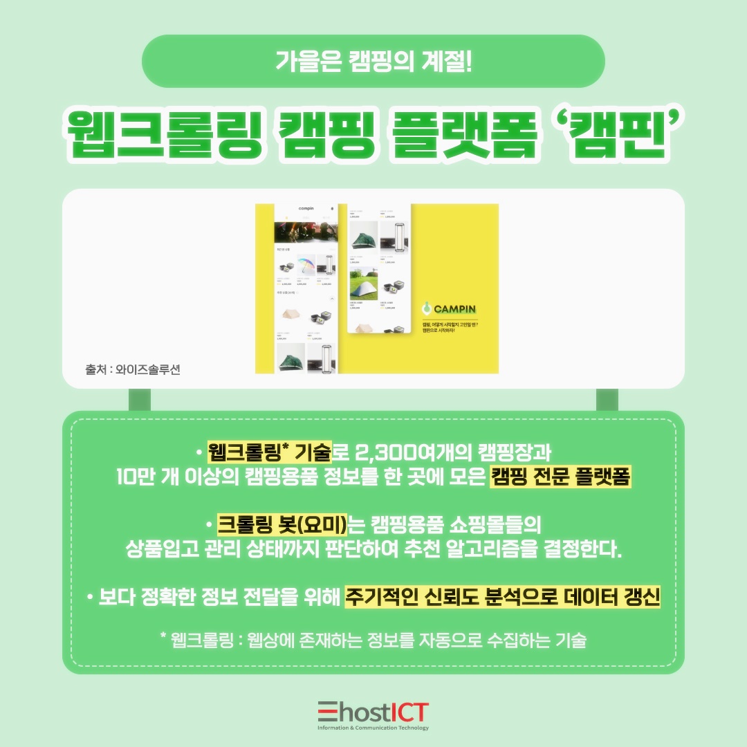 캠핀은 웹크롤링 기술을 활용하여 2,300여 개의 캠핑장과 10만 개의 이상의 캠핑용품 정보를 한 곳에 모은 캠핑 전문 플랫폼인데요. 크롤링 봇 (요미)는 캠핑용품 쇼핑몰들의 상품입고 관리 상태까지 판단하여 추천 알고리즘을 결정한다고 합니다. 보다 정확한 정보 전달을 위해 주기적인 신뢰도 분석 및 데이터 갱신을 한다고 하니 참고하여 활용해볼 수 있겠죠?