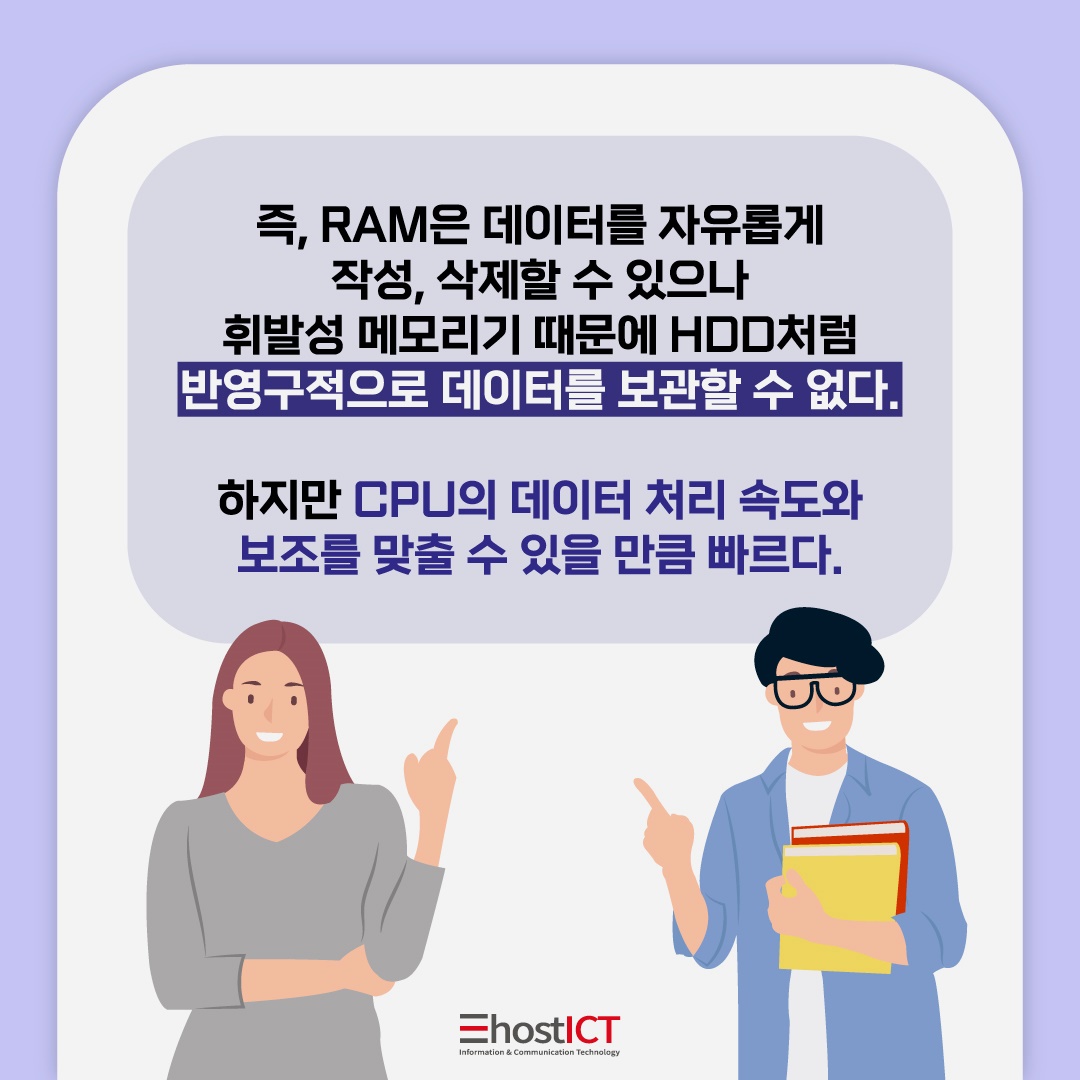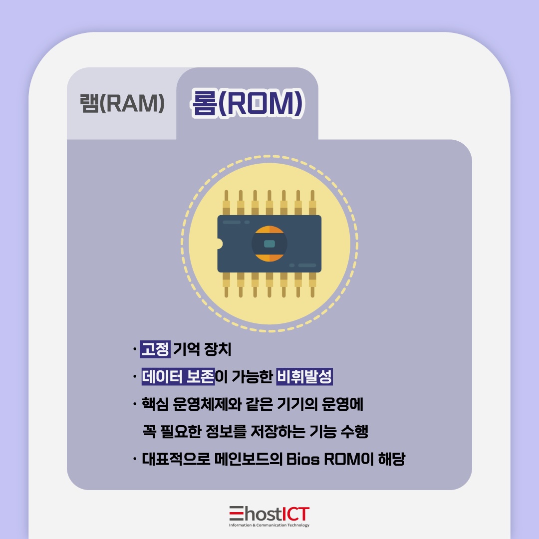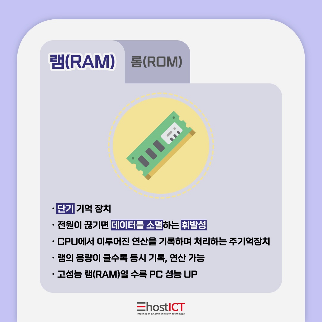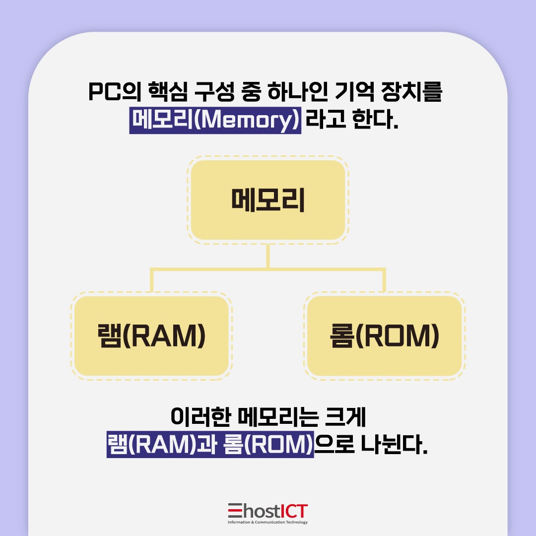 컴퓨터(PC)를 구매할 때 ‘메모리’ 용량을 확인하실텐데요. 컴퓨터의 핵심 성능은 CPU라고 할 수 있겠지만, 필요한 데이터를 적절한 용량의 메모리에 저장하는 것 또한 중요하게 고려해야 할 것입니다. 이번 IT 카드뉴스에서는 컴퓨터(PC)의 하드웨어 요소 중 꼭 알아둬야 하는 주기억장치 종류 RAM(램)과 ROM(롬)에 대해 알아보도록 하겠습니다.
