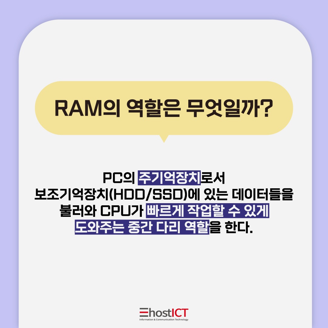 CPU에서 이뤄진 연산을 기록하며 처리하는 주기억장치로 역할하여 이 RAM(램)의 용량이 클수록 동시 기록과 연산이 가능합니다. 즉, 고용량 고성능의 RAM(램)일수록 컴퓨터의 성능이 올라간다고 볼 수 있습니다.