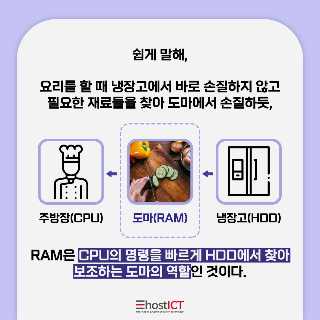 비유를 통해 컴퓨터 주기억장치의 종류인 RAM(램)과 ROM(롬)을 설명하자면, 위 이미지와 같은데요. CPU가 주방장이라면, RAM은 데이터 명령을 처리하고 보조하는 하는 도마, HDD는 데이터를 보존하는 역할을 하는 것입니다.