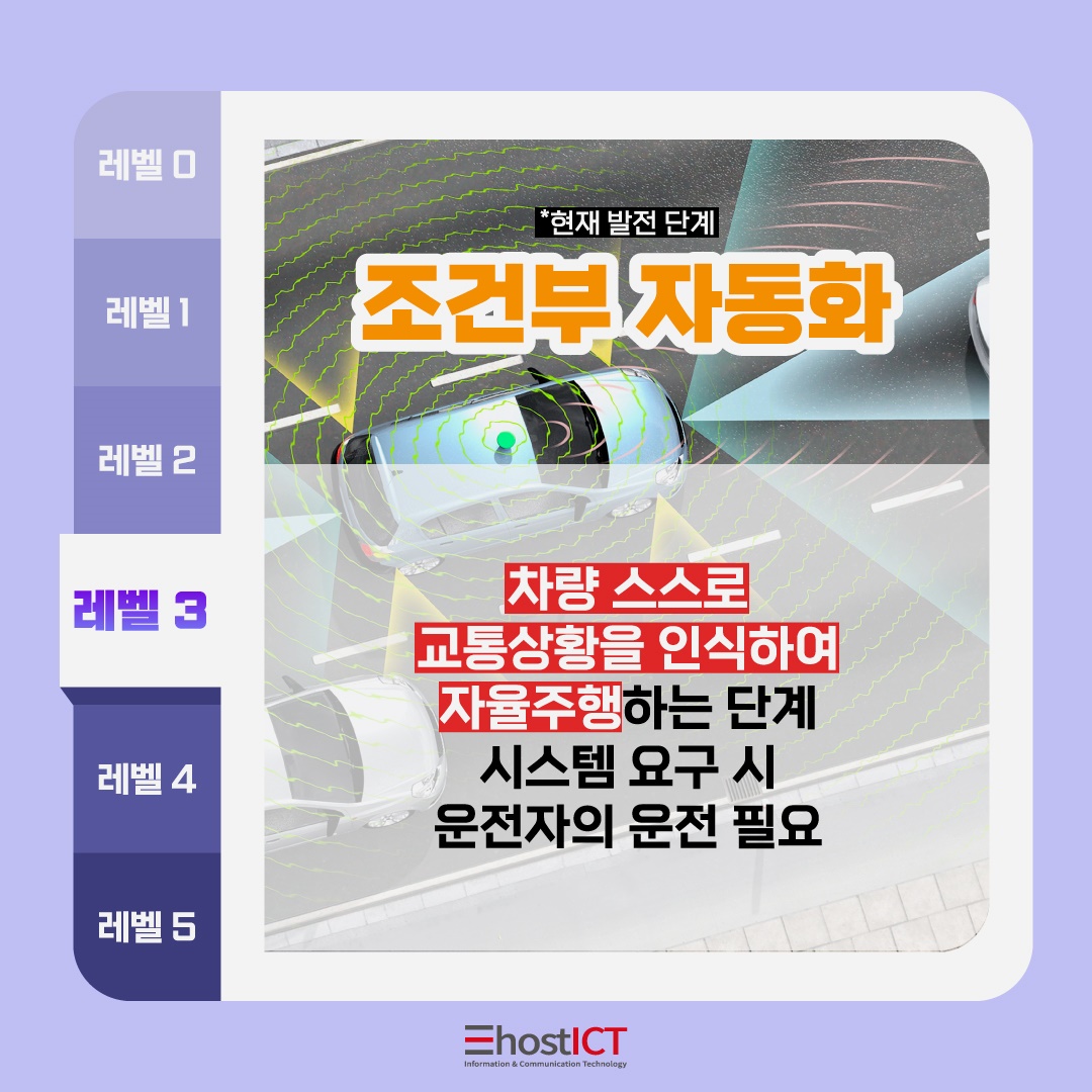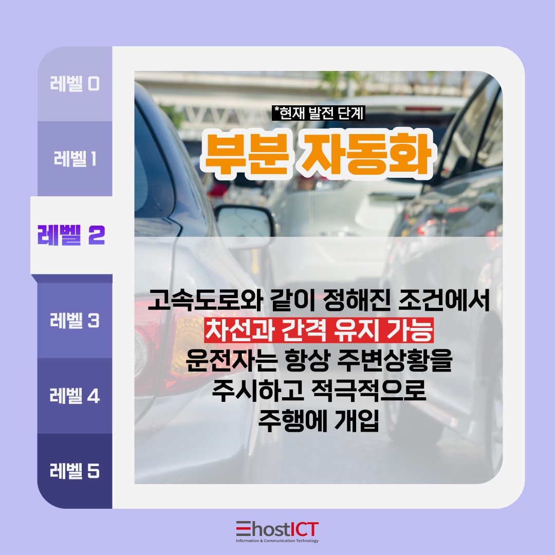 부분 자율주행 고속도로와 같은 조건에서 자율 주행. 필요 시 운전자가 즉시 개입. |
