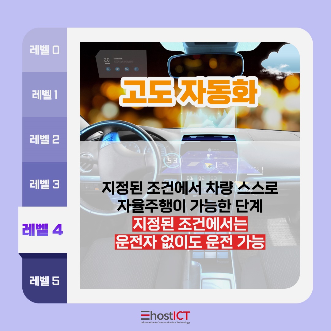 자율주행차 기술의 발전 단계 레벨 4는 고도 자동화(High Automation)입니다. 제한된 상황을 제외한 대부분의 도로에서 차량이 스스로 자율주행이 가능한 단계입니다. 즉, 운전자가 개입하지 못하는 상황에서도 스스로 안전하게 주행이 가능한 것입니다. 이 레벨 4 단계부터는 이전에서 발전하여 차량 운행의 주체가 시스템이 됩니다.
