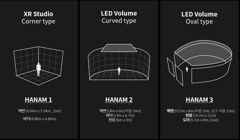'XR 스튜디오', '중형 볼륨 스튜디오', '대형 볼륨 스튜디오'까지 총 3가지로 구성이 되어있는데요. ‘XR 스튜디오’는 연면적 405㎡로 광고, 라이브 커머스에 최적화된 LED 월(가로 4.9m, 높이 3.34m) 2 세트를 갖췄습니다. 다음으로 ‘중형 볼륨 스튜디오’는 연면적 643㎡로 단편영화, 드라마, XR 공연 등 다양한 콘텐츠 제작에 최적화된 커브형 LED월(가로 18m, 높이 6m, 지름 14m)을 비롯해 천장과 바닥에도 LED 패널을 적용했습니다. 마지막으로 대규모 영화, 드라마 제작에 특화된 ‘대형 볼륨 스튜디오’는 1,088㎡ 규모로 국내 최대 타원형 LED 월(가로 53.5m, 높이 8m, 지름 19m, Wing 12m)을 도입한 아시아 최대 규모 버추얼 스튜디오입니다. 벽면과 천장을 LED 패널로 둘러싼 개폐형 방식의 360도 LED 스튜디오로, 피사체에 조명보다 더 자연스러운 빛을 구현할 수 있어 마치 현장에 있는 것 같은 현실감 있는 연출이 가능한데요.