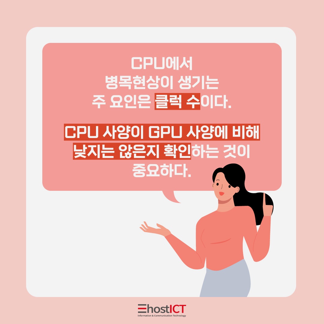 CPU에서 병목 현상이 생기는 주요 요인은 바로 클럭의 수 입니다. 컴퓨터의 두뇌 역할을 하는 CPU의 대표적인 성능 지표 중 하나인 ‘클럭’은 프로그램이 로드되는 속도와 프로그램이 얼마나 원활하게 실행되느냐에 중요한 영향을 미치기 때문인데요. 클럭의 속도를 높이기 위해서는, 오버클럭을 지원하는 메인보드 칩셋 등을 이용하여 ‘오버클러킹’을 하는 것이 좋습니다.