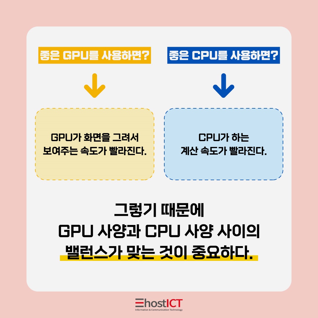 좋은 그래픽카드를 사용하게 되면 화면에 보여지는 속도가 빨라지며, 좋은 CPU는 연산 속도를 빠르게 합니다. 이 두 가지 요인의 밸런스가 맞아야 최적화된 성능을 느끼실 수 있는 것입니다. 둘 중 한 가지의 성능이 현저하게 떨어진다면, CPU 병목현상을 해결 하기 위해 조화를 맞춰 주는 것이 가장 중요합니다.