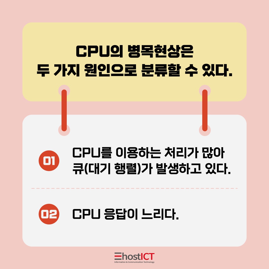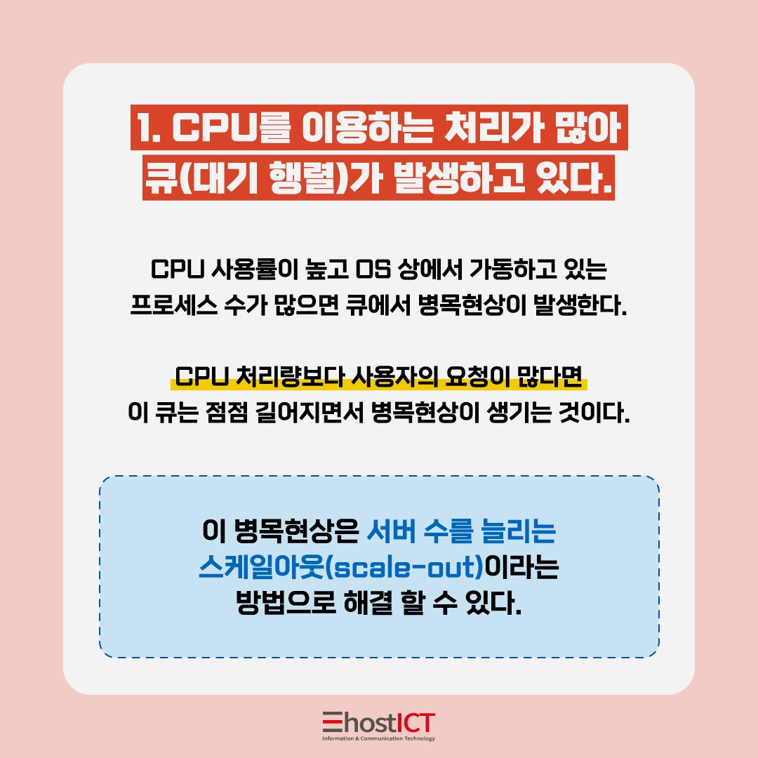 그 중에서도 CPU의 병목 현상은 크게 두 가지 원인으로 분류가 가능한데요. CPU를 이용하는 처리 양이 많아 큐(대기 행렬)이 발생하는 경우와 CPU 성능 자체가 낮아 응답이 느린 경우입니다.
