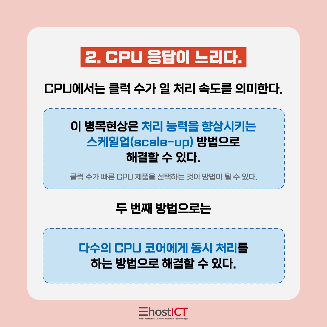 CPU 병목현상 두 번째, 클럭이 낮아 일 처리 속도가 느린 경우입니다. 보통 응답 속도가 느린 경우를 의미하는데요. 이러한 경우에는 위에서 CPU의 처리 능력(속도)를 향상시킬 수 있는 스케일업(Scale-up) 방법으로 해결이 가능합니다.