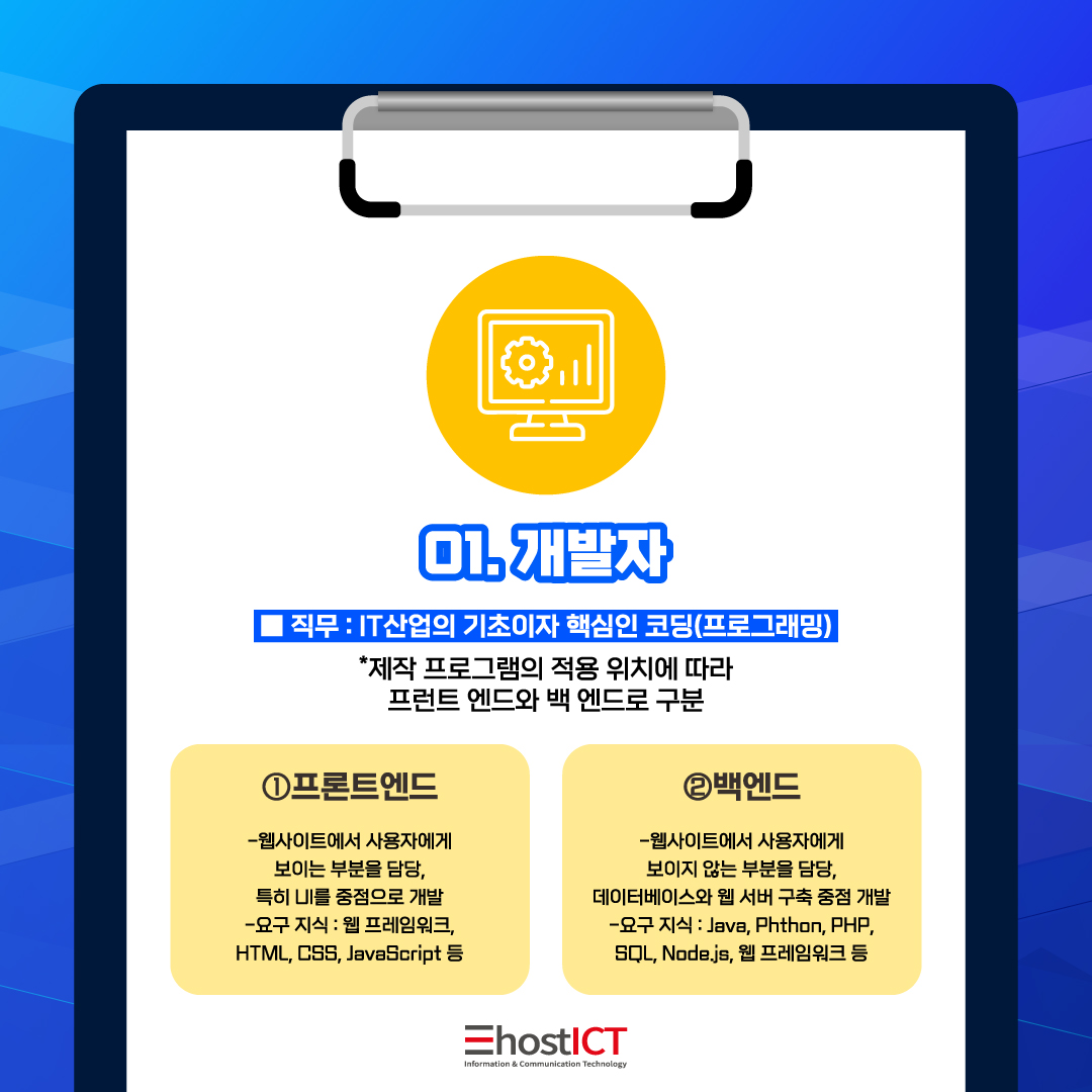 보이지 않는 서버 시스템에서 작동하는 프로그램을 제작하는 개발자는 백 엔드 개발자, 앱이나 웹사이트 등의 레이아웃을 구성하고 컬러, 메뉴, 폰트 등 사용자 경험(UX)을 극대화할 수 있도록 눈에 보이는 부분을 구성하는 개발자를 ‘프런트 엔드’ 개발자 라고 표현합니다.