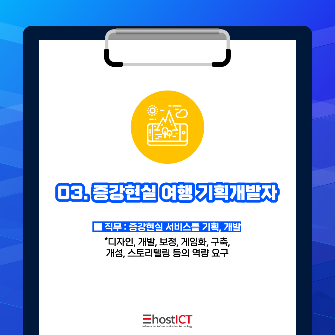 세 번째로는 증강현실 여행 기획개발자 인데요. 이는 좀 생소하게 느껴질 수 있지만 말 그대로 증강현실(AR)을 사용하여 마치 실제로 여행을 다녀온 것과 같은 경험을 제공하는 서비스를 기획하고 개발하는 전문가를 일컫습니다.