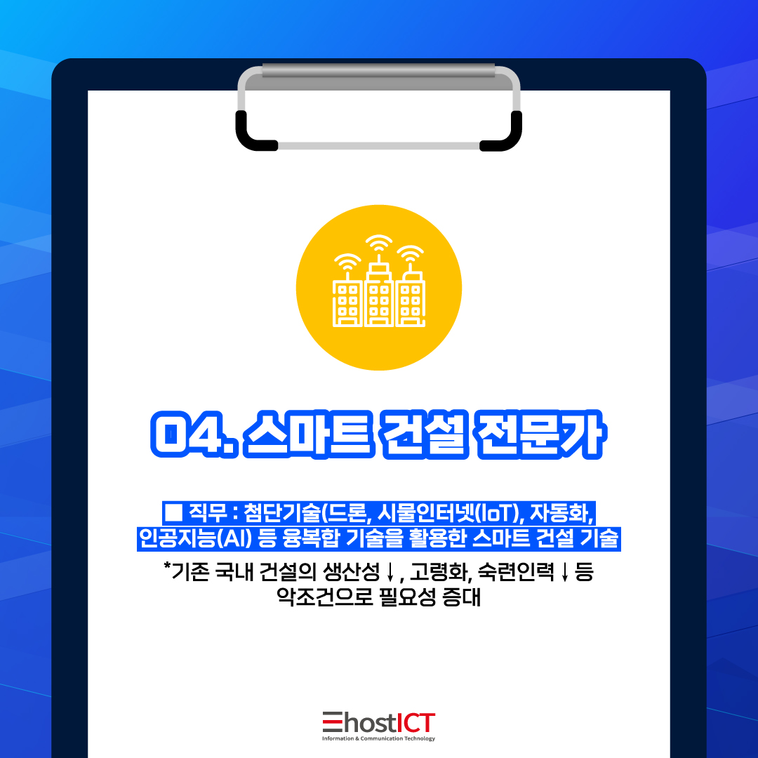 IT 유망 직업&직종 네 번째는 스마트 건설 전문가로, 건설 산업 분야에 첨단 기술 (드론, 사물인터넷, 자동화 인공지능 등)을 융합하는 역할을 합니다. 첨단 IT 기술을 건설에 적용하여 ‘스마트 건설’을 주도하여 안전성과 효율성을 강화하는 것인데요.