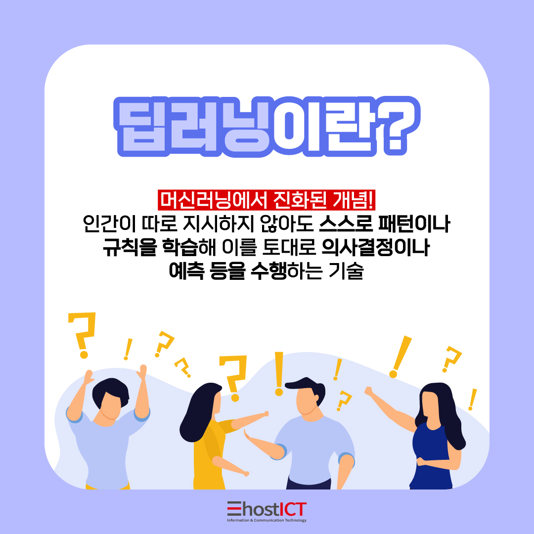딥러닝 기술이란, 머신러닝의 특정 분야에 대해 특화된 형태로써, 학습할 데이터를 인간이 직접 입력하지 않아도 기계 스스로 중요한 패턴 및 규칙을 학습하고 이를 토대로 의사 결정이나 예측 등을 수행하는 기술을 말합니다.