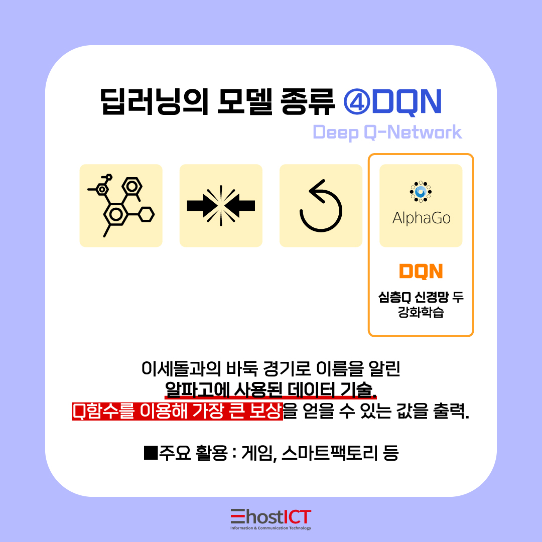 마지막으로 DQN인데요. 이 모델이 바로 이세돌과 바둑 경기를 펼쳤던 알파고에 사용된 데이터 기술입니다. Q 함수를 이용해서 가장 큰 보상을 얻을 수 있는 값을 출력하는 방식으로 상태와 행동을 입력으로 주면 기대값을 출력해 주는 함수입니다. 주로 게임과 스마트 팩토리에 활용되고 있습니다.