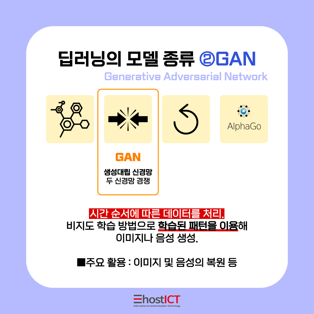 시간의 순서에 따라 데이터를 처리하는 방법으로, 비지도 학습 방법을 사용해 학습된 패턴을 이용해서 이미지나 음성을 생성합니다. 즉 데이터의 분류가 가능한 분류 모델을 먼저 학습시킨 후에, 학습된 분류 모델을 속이는 방향으로 데이터를 생성하는 생성 모델을 학습시키는 과정을 반복해서 각각의 역할을 가진 두 개의 모델을 통해서 진짜 같은 가짜를 생성해내는 능력을 키워주는 것이 GAN의 핵심입니다.